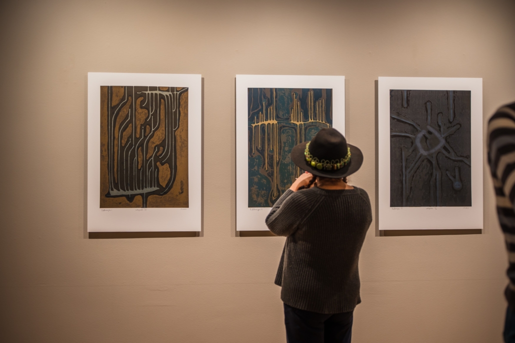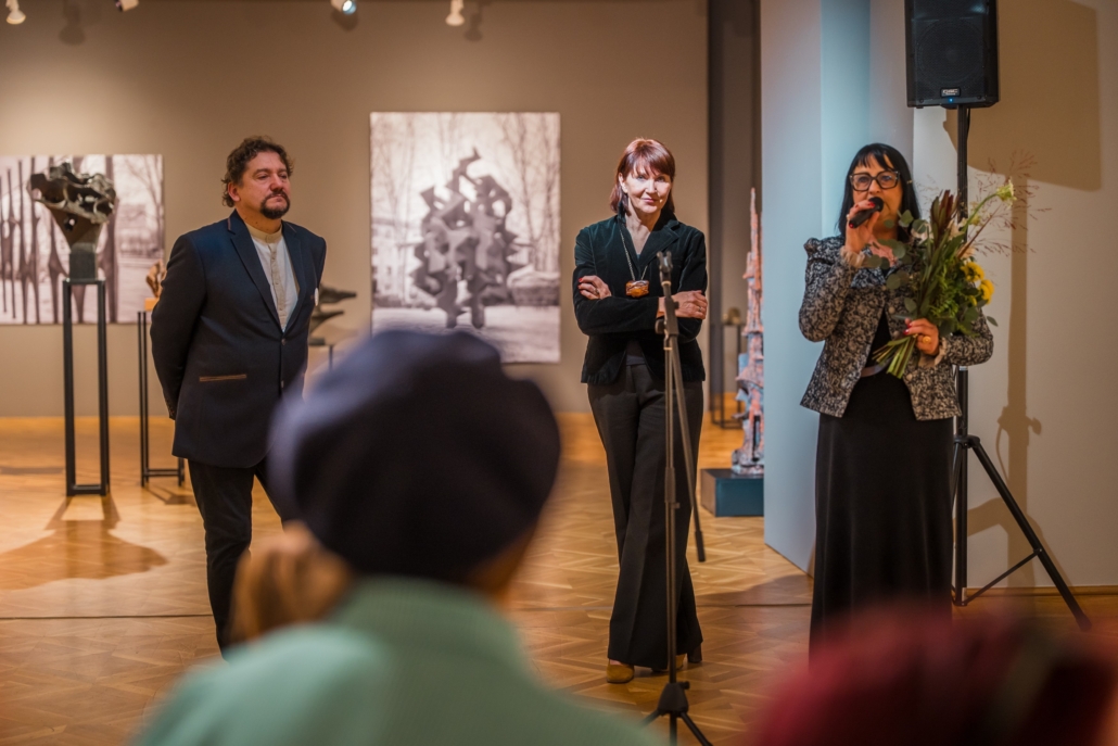 Atklāšana. No kreisās mākslinieks Jānis Murovsis, kuratore Inga Bunkše, Liepājas muzeja direktore Dace Kārkla. Foto Kārlis Volkovskis